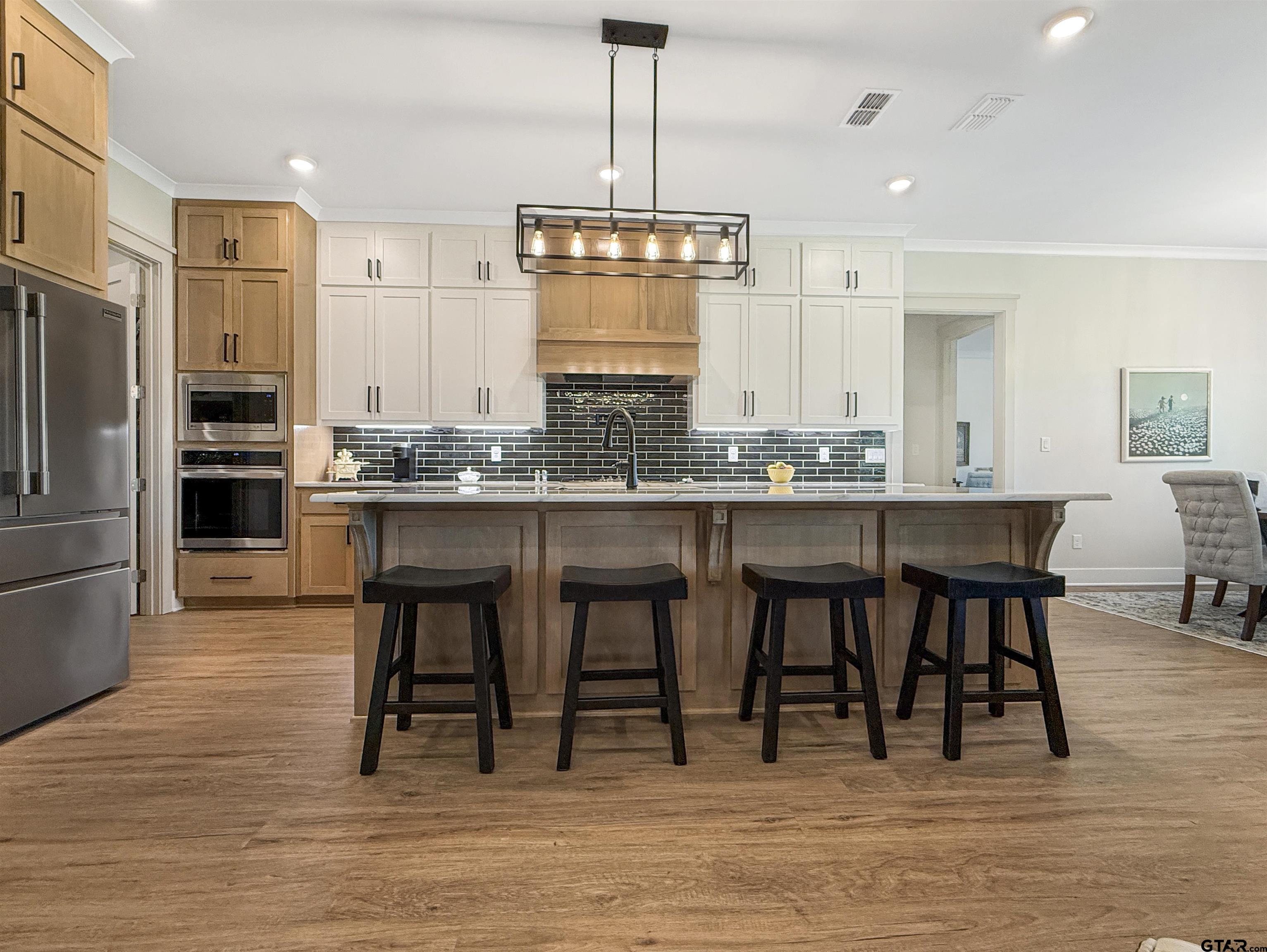 | This gorgeous, one-owner family home sits on a half-acre lot in Bullard ISD and is pristine in every aspect, making it ideal for entertaining. It offers an open-concept kitchen and living room, a large dining area, a split-bedroom design, and custom upgrades throughout. The versatile floor plan can be configured as four bedrooms or three bedrooms with an office. The fabulous kitchen features quartzite counters, stainless steel appliances (including a refrigerator), and a huge walk-in pantry with stunning butcher block counters and built-in shelving. All bathrooms have beautiful granite, and the master bath boasts a large shower, a spacious soaking tub, and abundant storage. Additional highlights include custom landscaping, plantation shutters, a sprinkler system, privacy fencing, and an oversized garage with epoxy flooring. This subdivision, located adjacent to Eagle’s Bluff, offers the option—but not the requirement—to join the country club and is within walking distance of the new Eagles Bluff Golf Performance Center, scheduled to open in fall 2025. Be prepared to be impressed by this exceptional property. | |