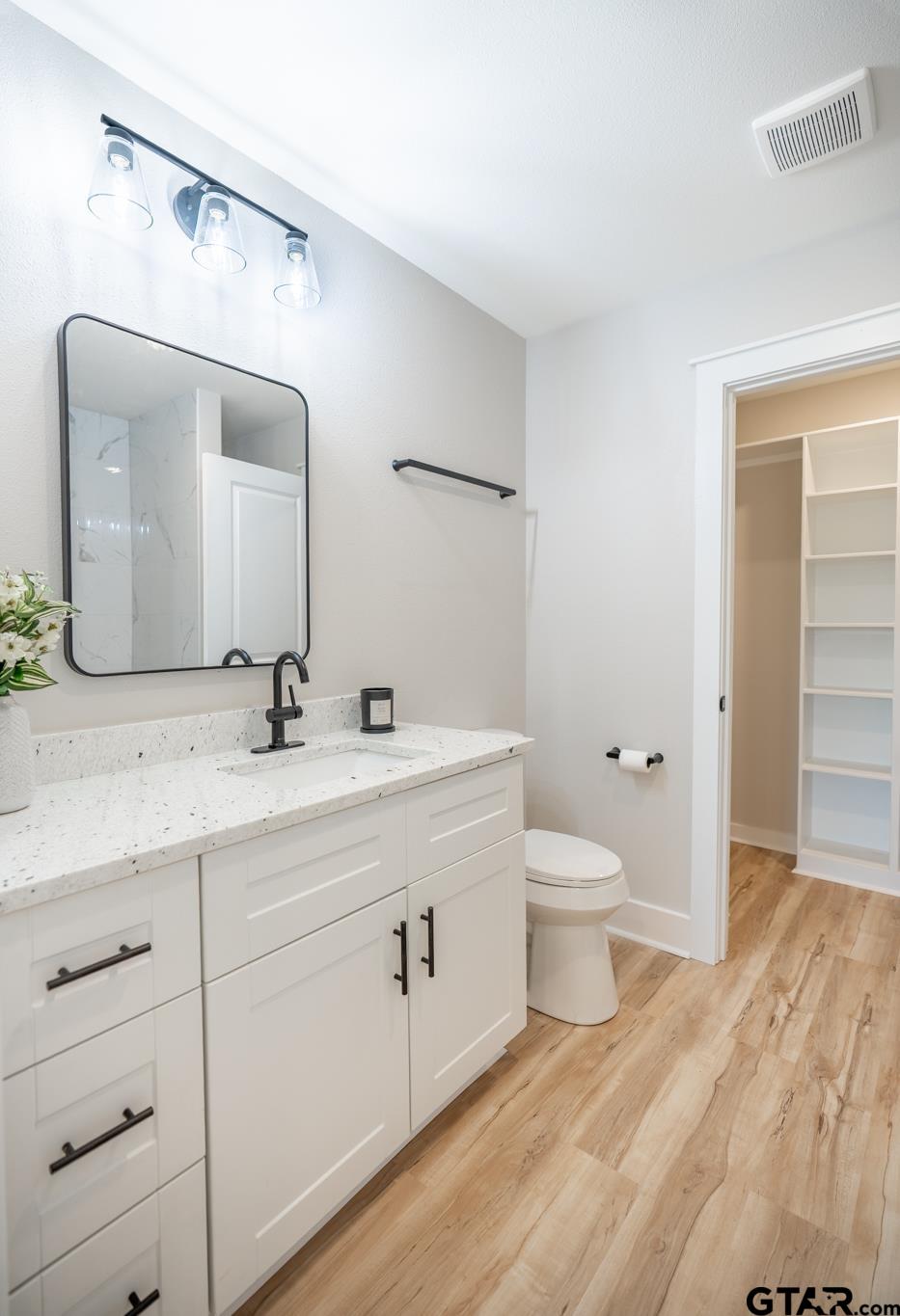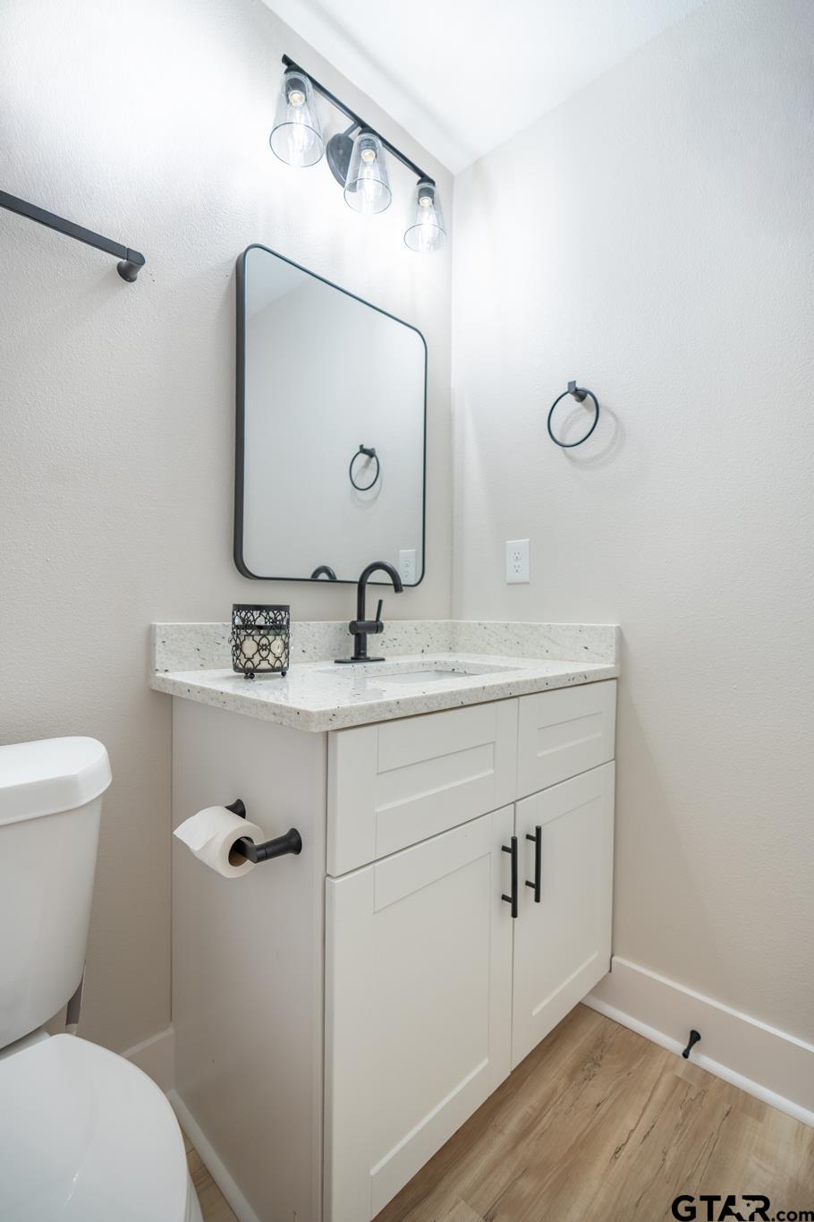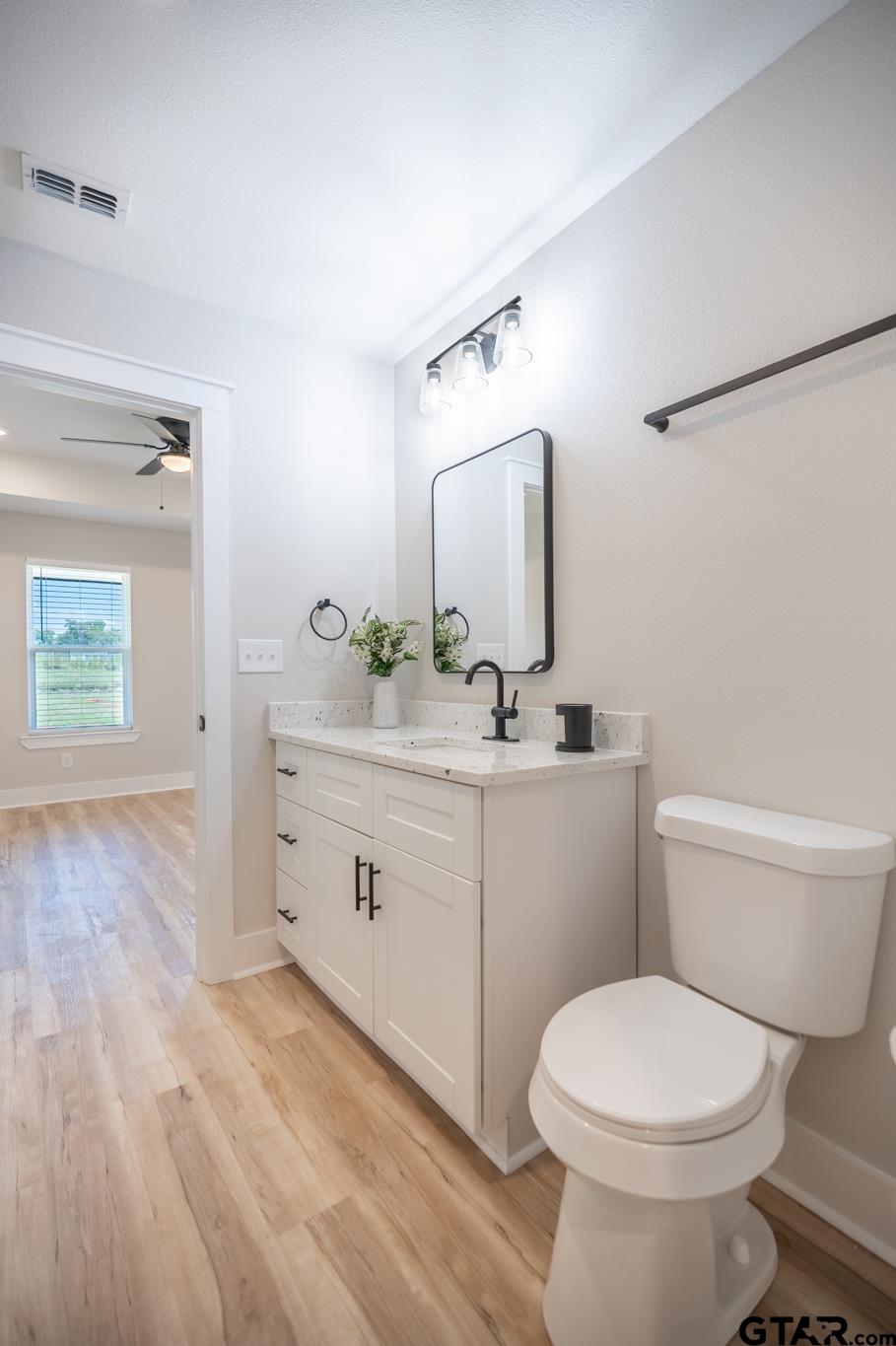 Adorable cottage with cozy front porch in popular Bullard ISD! This 3 bedroom 2 bath home features an open concept kitchen and living room area with vaulted ceilings and recessed lighting making living area appear light, bright and spacious. The kitchen area features granite countertops, white cabinetry, stainless steel appliances and stylish black hardware. Light wood finish vinyl plank flooring is found throughout along with modern paint color choices. Middle bath offers a tub/shower combo and granite countertops. Primary bath offers large tile shower surround and penny tile floors in walk in shower. Primary bedroom offers a private exit to a private back patio overlooking the spacious backyard. Home sits on almost 1/3 of an acre in a gated community with close proximity to Lake Palestine! | |