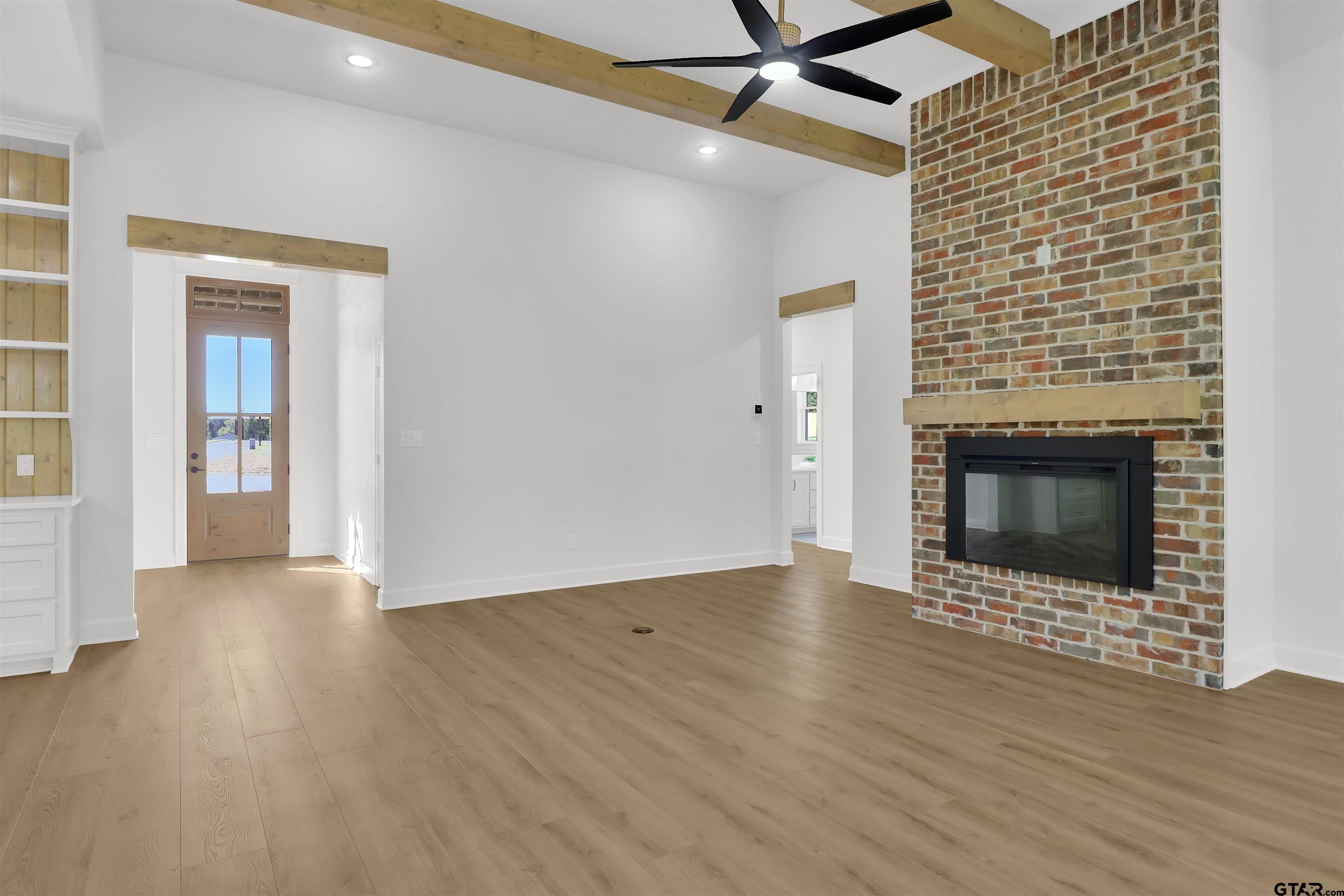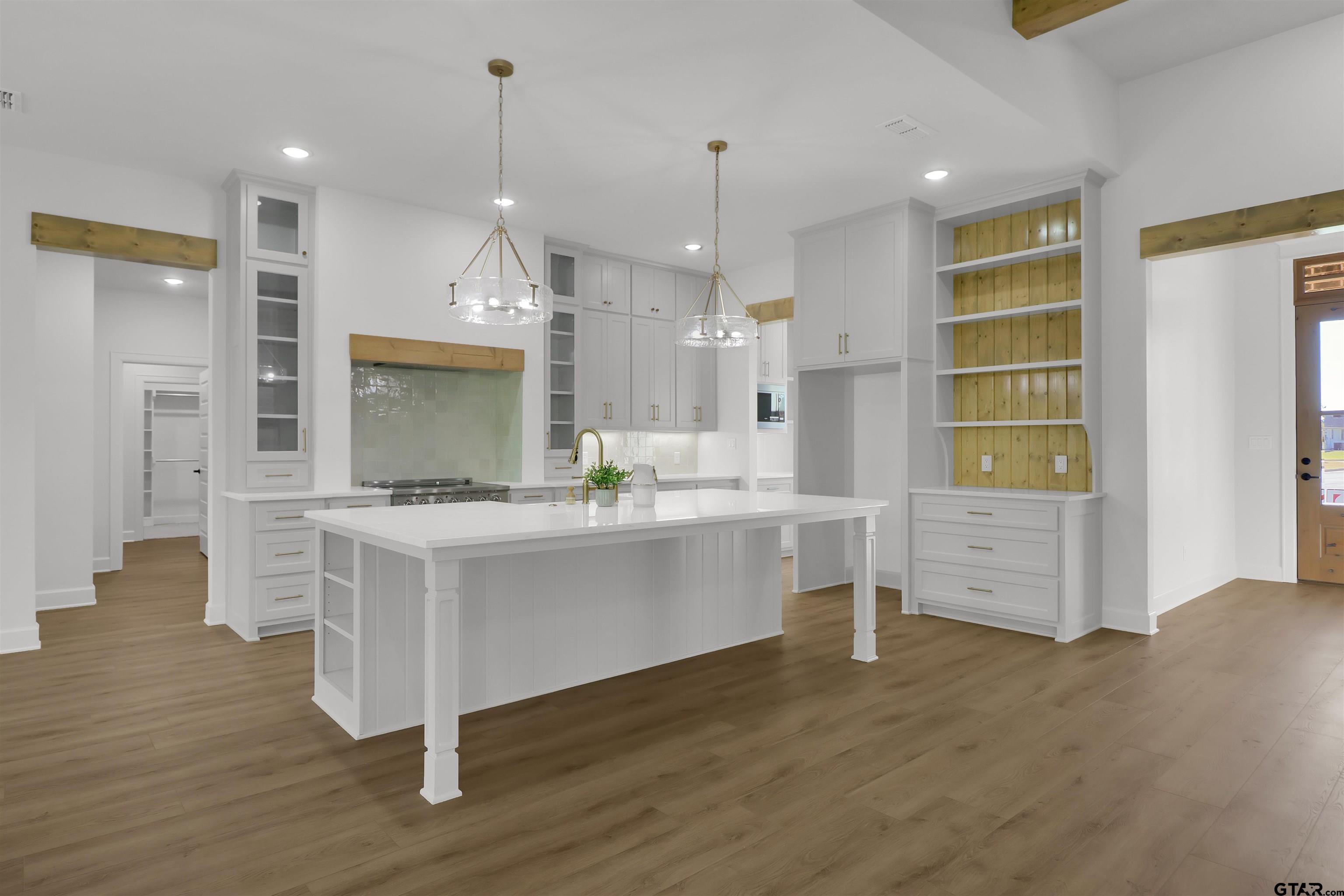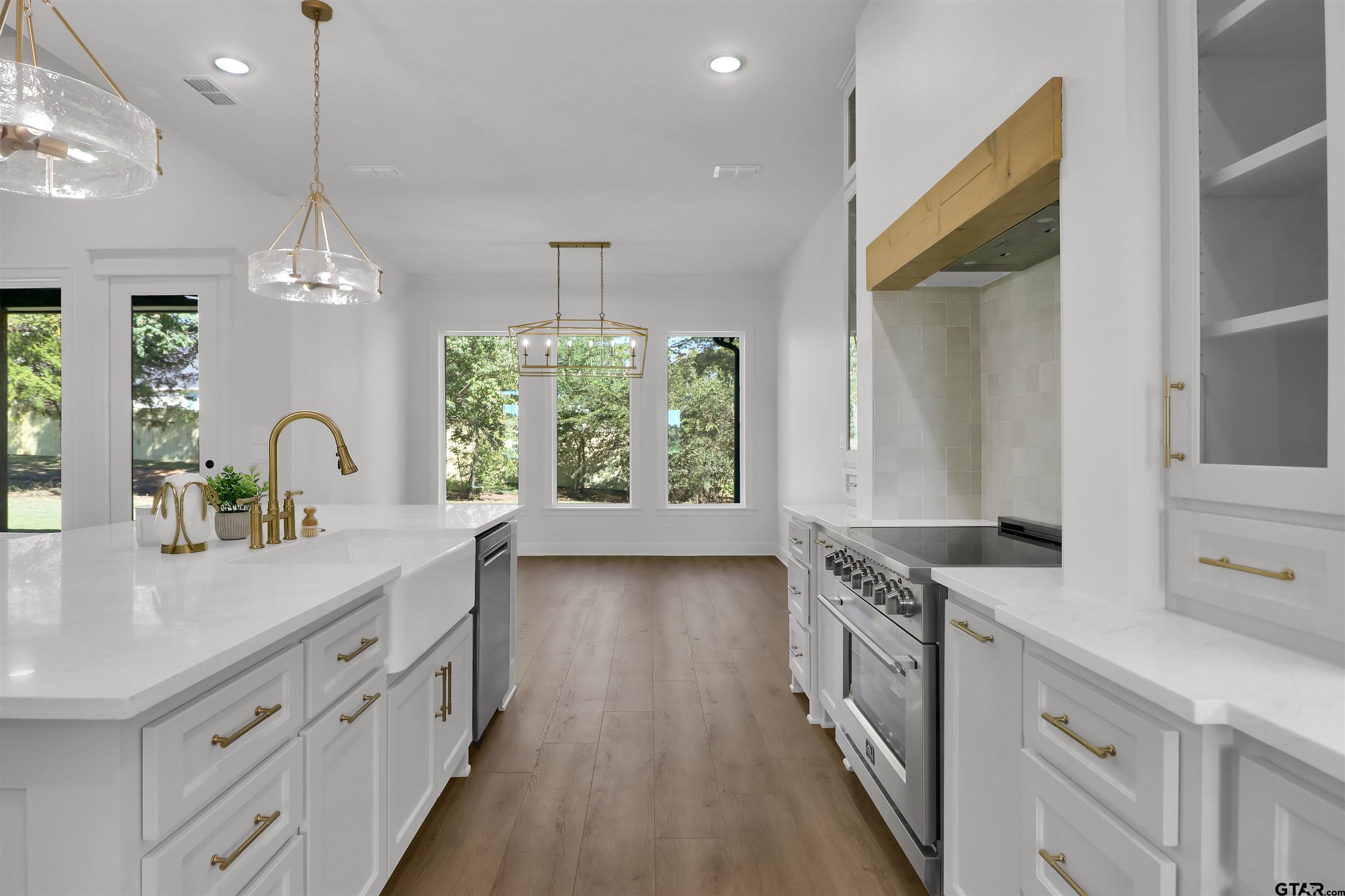 | Stunning Transitional-style home nestled at the end of a cul-de-sac for the perfect Country Living feel. 17560 Sugar Bluff Ln, located in Sugar Ridge Estates! Just gorgeous! Custom features galore! Open floor plan, 4 bedrooms, 2.5 baths, and oversized 2 car garage with double garage doors. Split bedroom layout with natural light pouring in throughout the home. Kitchen has beautiful quartz, large island, 36†professional range, apron sink and custom cabinets! Furniture-style open shelving unit with wood accent. Gold finishes and fixtures and SS appliances. Prep area off the kitchen leading to the large walk-in Pantry with butcher block countertops and tons of storage. Mudroom and 1/2 bath off the garage leading to the Laundry that connects to one of the master closets…yep, there’s TWO closets in the master! Master Bath is to die for! Freestanding tub and walk-in shower with custom tile work and gold finishes! Electric fireplace in the Family Room with floor to ceiling brick surround. Large windows across the living and dining room provide lots of light and great view of the beautiful backyard! Family room leads to the large covered porch with great privacy provided by mature trees. Carpet in bedrooms, high-end LVP flooring throughout main area, and tile in baths. Spray foam in the attic and energy efficient windows! No HOA, two street curb-and-gutter subdivision in Flint, Texas. Close to Loop 49, Hwy 155S and Lake Palestine. You must see this New Happy Home. | |