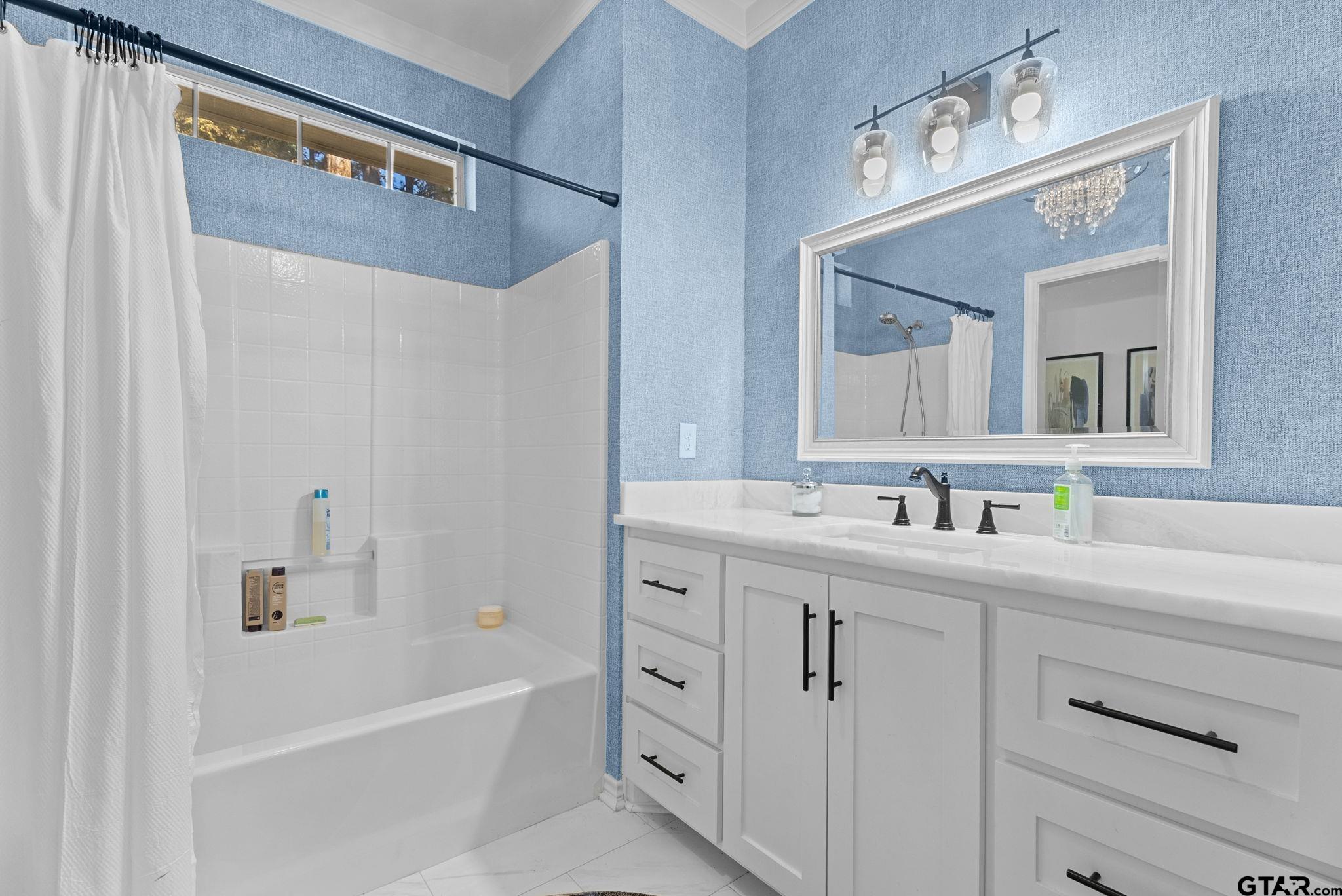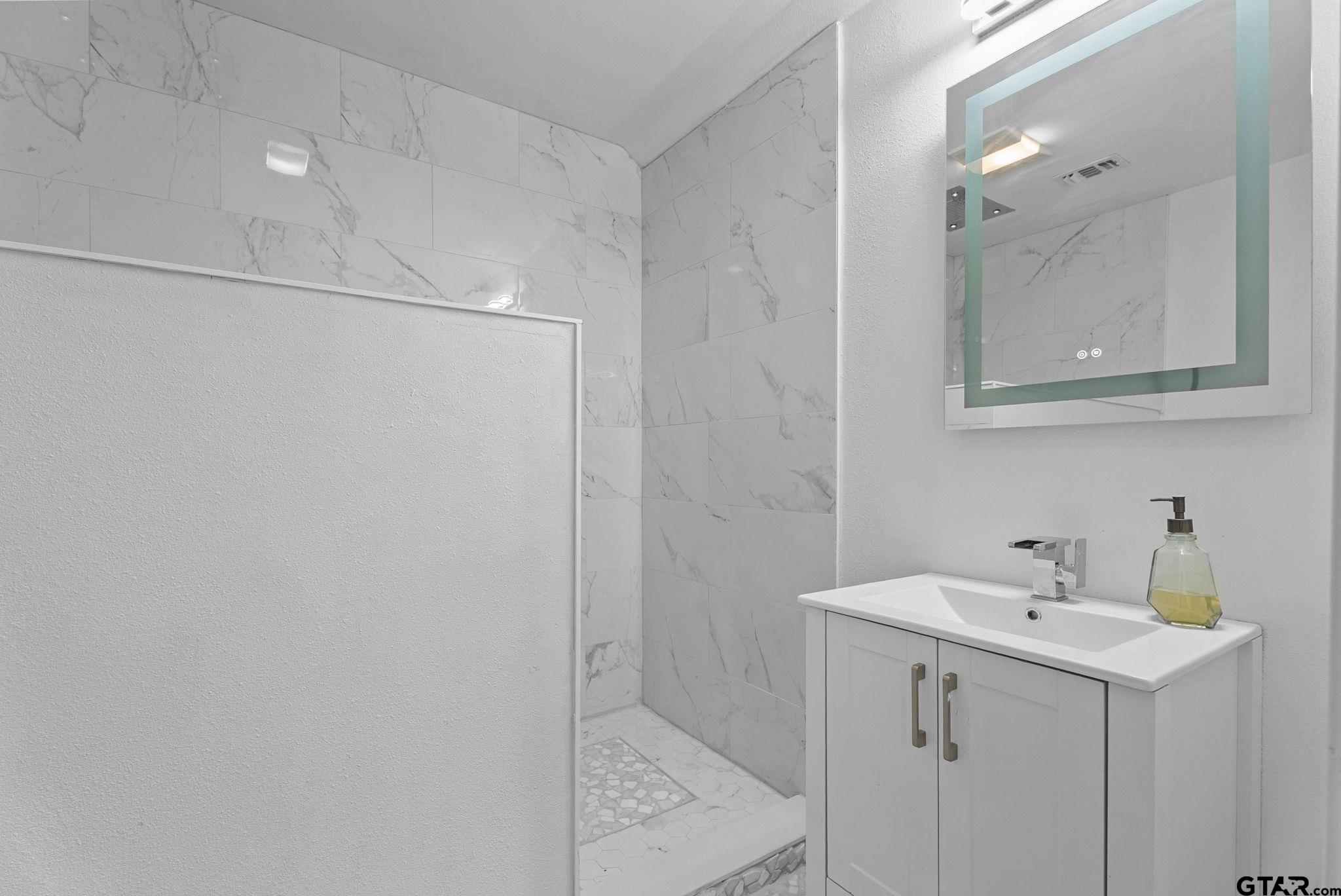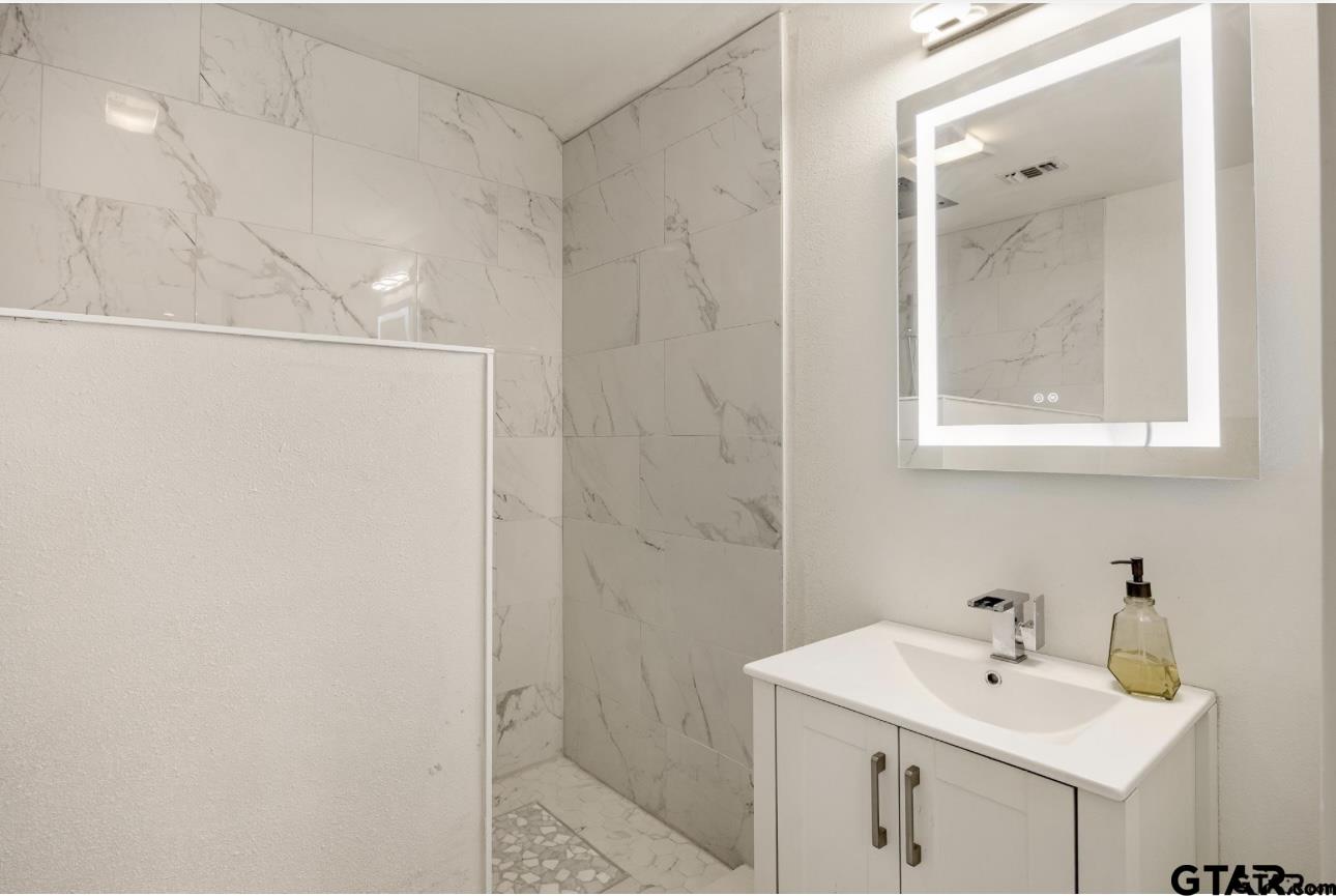 | This home has had a complete remodel. The home sits on 3 lots in The Villages and blocks away from Lake Palestine and the marina. The home features 4 bedrooms, 3 baths and a 2 car garage. Every inch of this home has been thoughtfully updated, creating a truly move-in-ready retreat just minutes from Tyler. Step inside to discover a desirable open-concept layout with luxury vinyl flooring throughout—both upstairs and down. The chefs kitchen features marble countertops, high-end custom cabinetry, stainless appliances, large island and a hidden walk-in pantry. Each bathroom has been renovated with marble countertops, custom tile work in the primary and upstairs baths, and stylish, upgraded fixtures. Upstairs has been transformed into a flex space, perfect for a mancave, office or a workout room complete with a bedroom and an additional living area. Also, the home has newly built stairs, a cozy fireplace with floating shelves, and a mudroom with a bench and storage for added convenience. Enjoy peaceful outdoor living with stamped and stained concrete patios in the front and back, surrounded by mature trees and a mosquito spray system to keep your space comfortable year-round. Don’t miss this rare opportunity to own a beautifully updated home in a serene setting, with the perfect mix of privacy and accessibility to Lake Palestine. | |